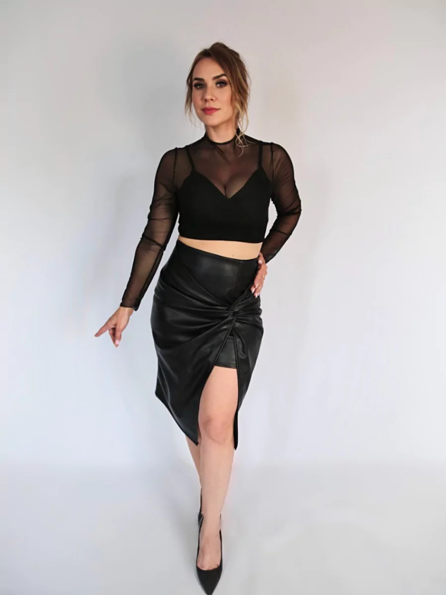 Midi-length leather skirt with cut-out front.